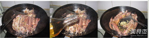 2、炒至皮皮蝦變紅并且蝦皮發干,淋入少許料酒,加入姜蒜末